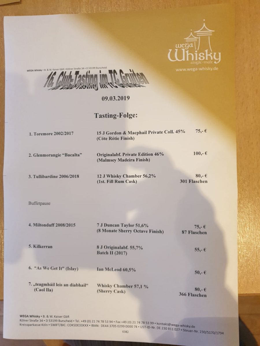 Mit 23 Teilnehmern in wieder gemütlicherer Runde geriet das 16. Clubtasting im TC Gruiten nahezu zum Rare Malt, denn fünf von sieben Abfüllungen waren seit langem nicht mehr zu bekommen - nur noch in sehr begrenzter Anzahl an diesem Abend.
