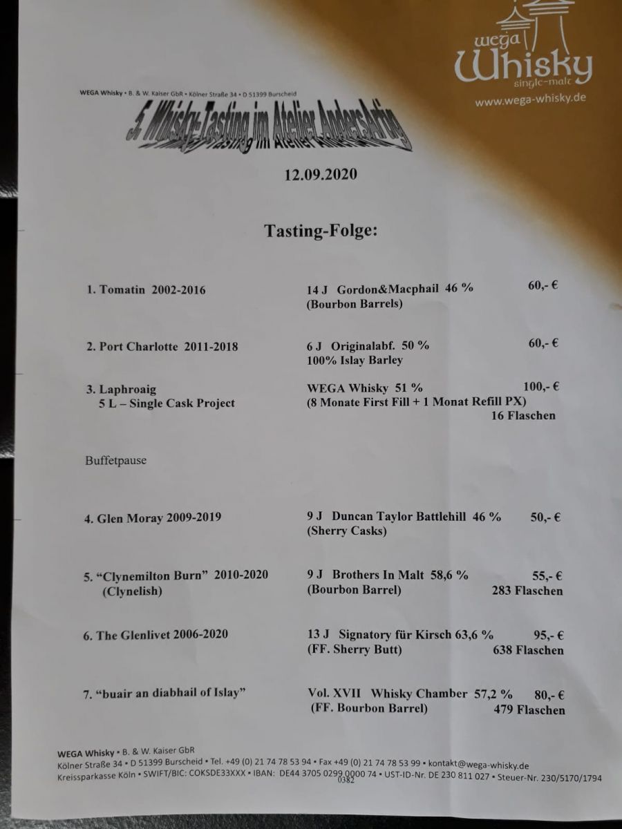 Die Single Malts des Abends waren abwechslungsreich wie selten - schließlich ist in den Monaten des Shutdowns, in der wir weiterhin auf Suche nach tollen Tröpfchen waren, kaum etwas wieder weggegangen - sodass wir aus dem Vollen schöpfen konnten. Die Reihenfolge war daher gleichzeitig harmonisch und doch sehr unorthodox. Gerade im zweiten Teil nach der Pause wechselten sich Bourbonfass-Abfüllungen mit Sherrybomben ab - was erst unter vielen Teilnehmern bei der Lektüre des Probenblattes ungläubiges Staunen hervorrief - doch der Balanceakt gelang.